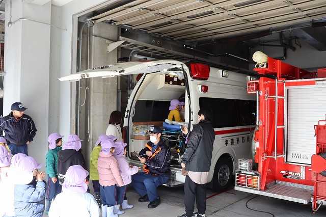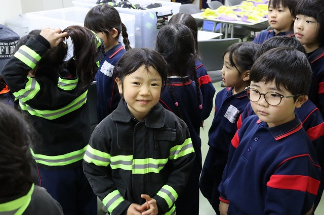 消防服を着ての消火体験や、救急車・消防車の中をじっくり見せていただいたこと、